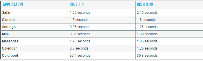 Some of the noteworthy inferences we could make from the speed comparison table (iOS 8 and iOS 7.1.2) are as follows: