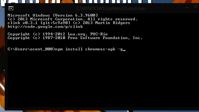 - In a command prompt, run the following command: npm install chromeos–apk -g